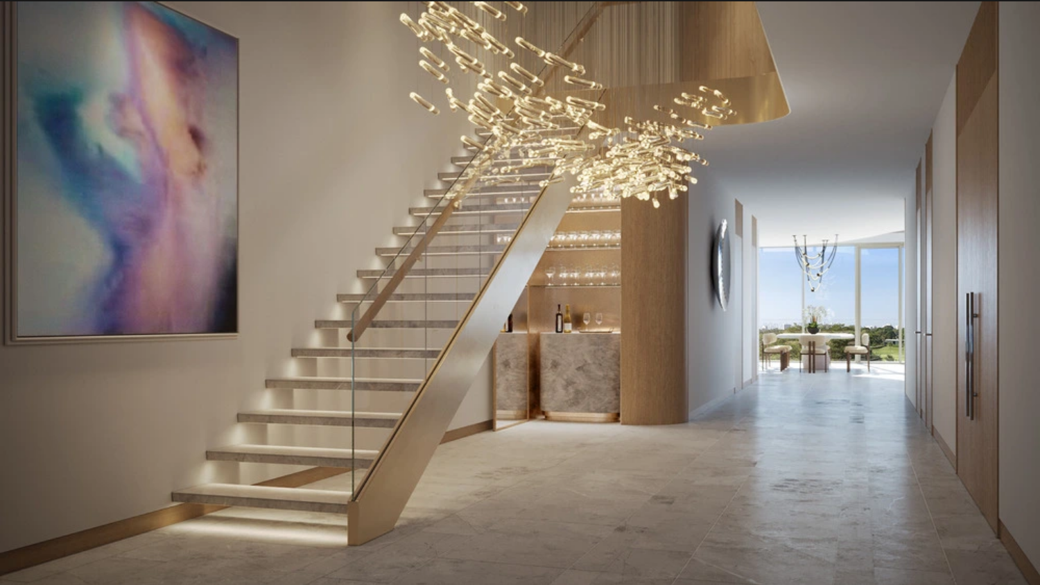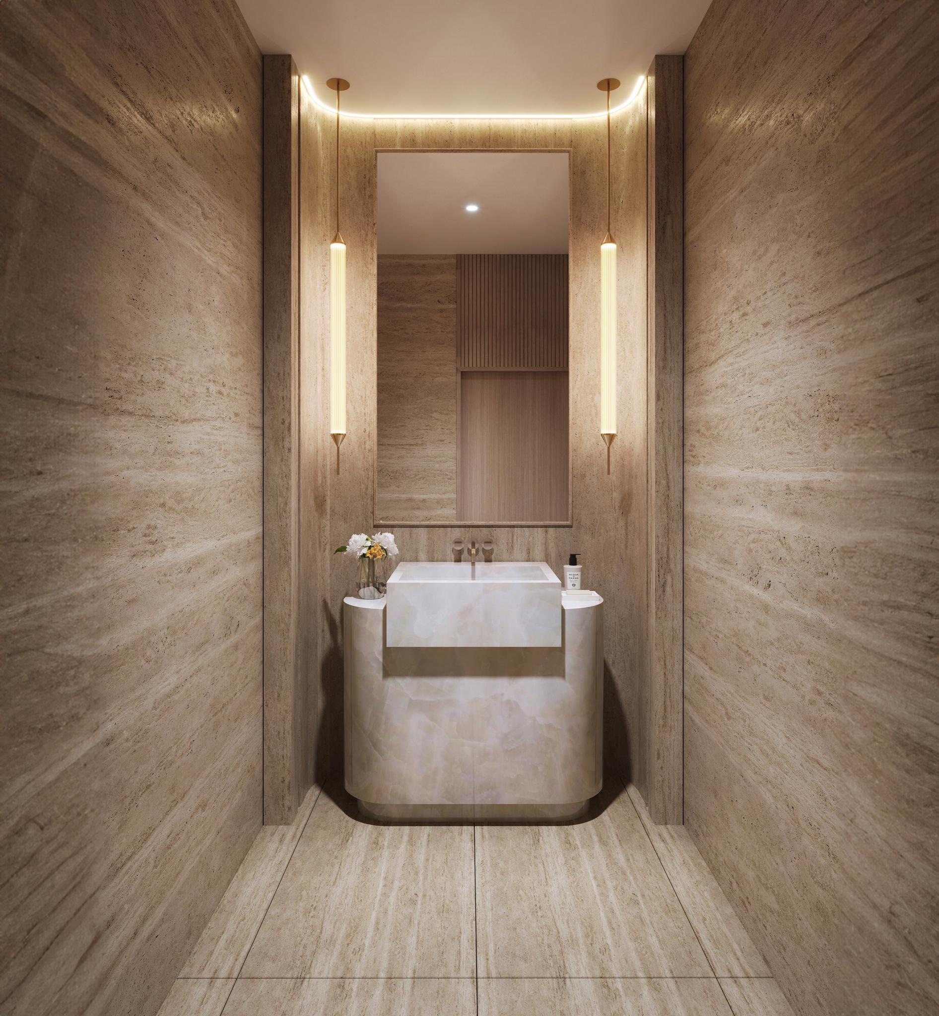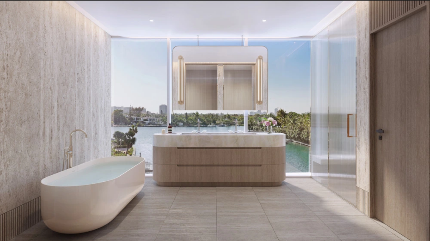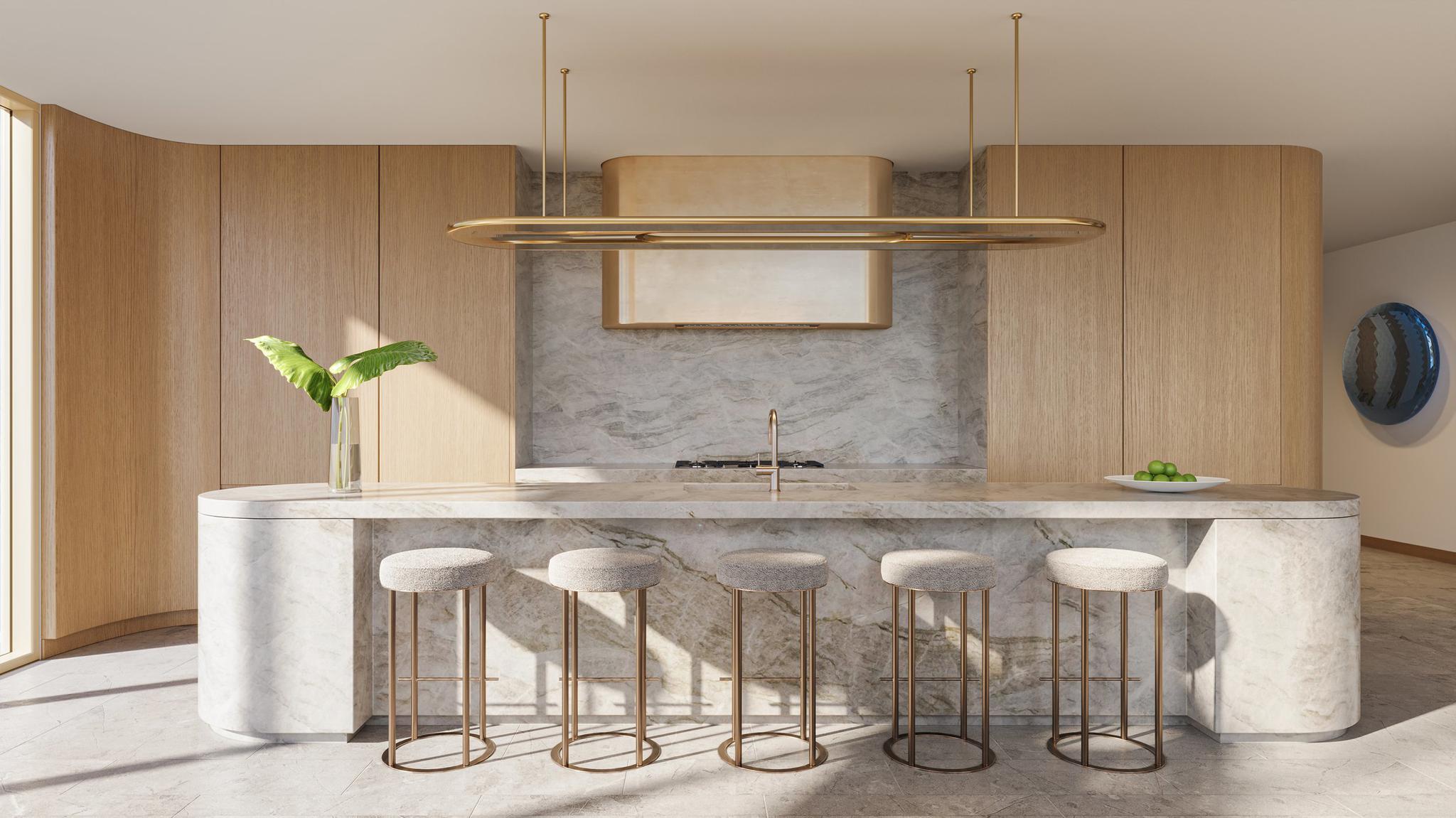 The building itself is a masterpiece of modern architecture, expertly reimagining the iconic Mimo-Miami style with graceful curves and sculptural lines. Opulent materials adorn the exterior, featuring a captivating mix of limestone veneer and custom glass-wrapped facades, setting the stage for the exquisite homes within.